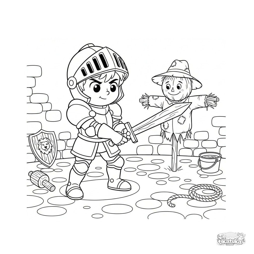 Ausmalbild für Jungen: Ein junger Ritter trainiert mit einem Schwert im Burghof. Für Kinder von 5-8 Jahren. Mit einem Schild, einer Vogelscheuche und mittelalterlichen Requisiten.