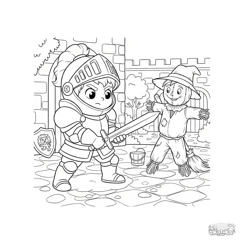 Ausmalbild für Jungen 4-6: Ein junger Ritter in Rüstung übt Schwertkampf mit einem Holzschwert gegen eine Vogelscheuche auf einem Burghof.