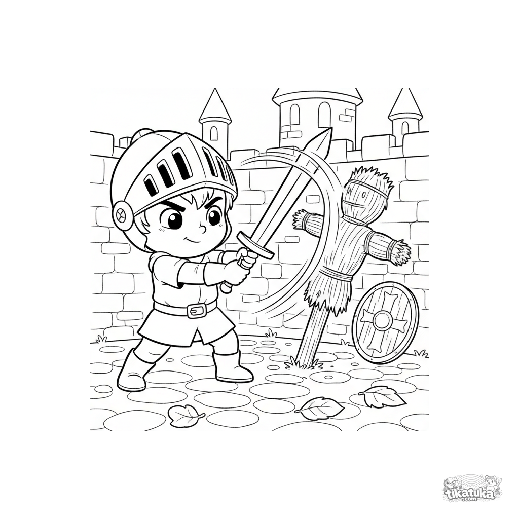 Ausmalbild für Jungen 4-6: Ein junger Ritter trainiert mit einem Holzschwert in einem Schlosshof. Eine actionreiche, einfache Szene.