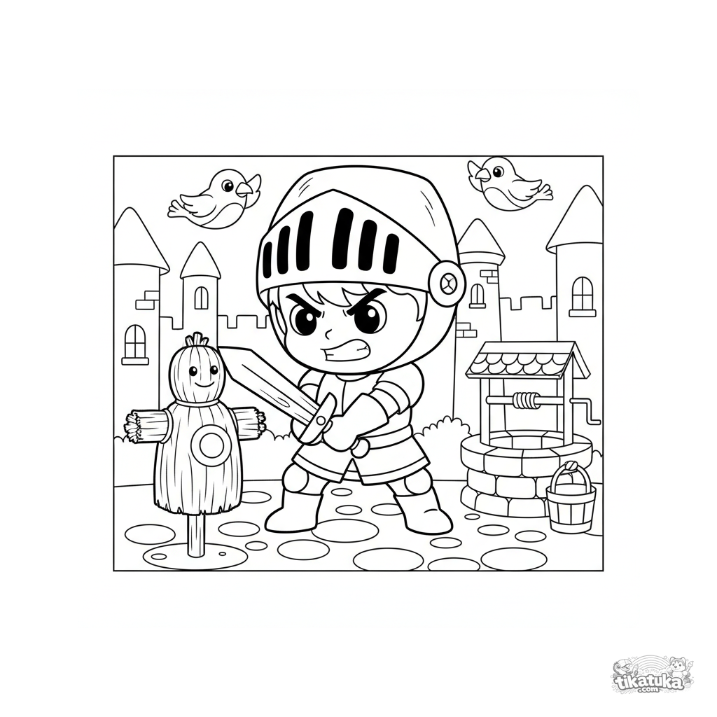 Ausmalbild eines jungen Ritters, der mit einem Holzschwert im Schlosshof übt. Für Jungen von 4-6 Jahren. Dynamische Szene.