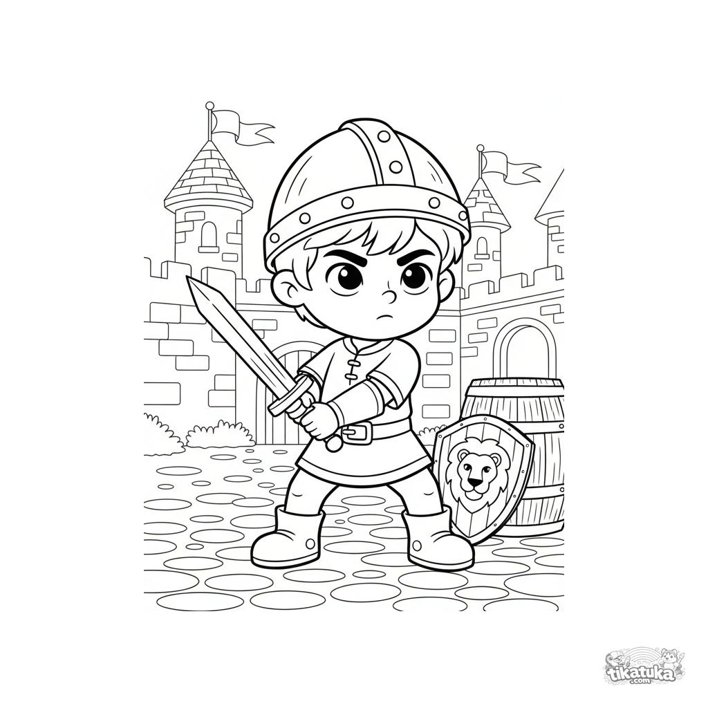 Ausmalbild für Jungen: Ein junger Ritter übt mit einem Holzschwert auf einem Burghof. Für Kinder von 5-7 Jahren.