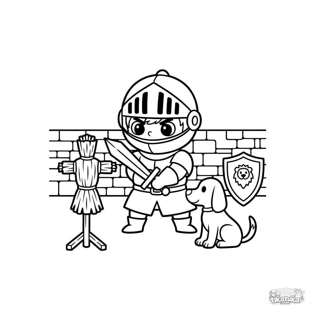 Ausmalbild für Kleinkinder 2-5: Ein junger Ritter übt mit einem Holzschwert gegen eine Strohpuppe im Burghof. Einfache Umrisse.