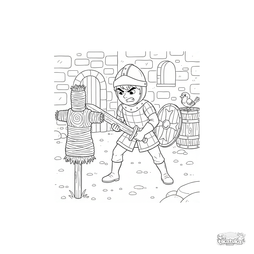 Ausmalbild eines jungen Ritters, der mit einem Holzschwert im Burghof trainiert. Für Kinder von 5-8 Jahren. Realistischer Stil.