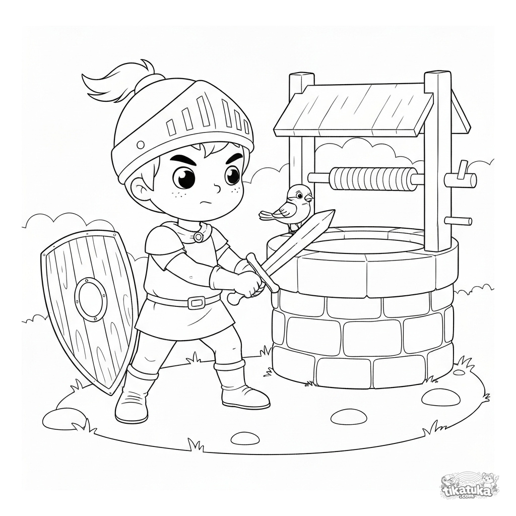 Ausmalbild eines jungen Ritters, der mit einem Holzschwert vor einem Steinbrunnen übt. Für Kinder von 5 bis 8 Jahren.