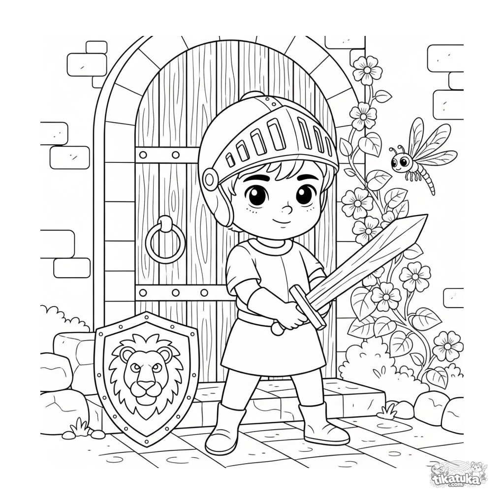 Ausmalbild eines jungen Ritters, der am Burgtor übt. Für Kinder von 5-8 Jahren. Er hat ein Holzschwert und einen Schild mit Wappen, eine Libelle in der Nähe.