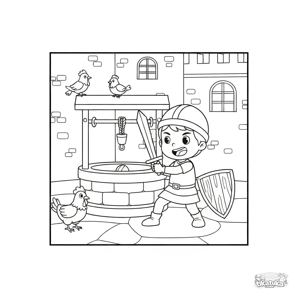 Ausmalbild eines jungen Ritters, der mit einem Holzschwert an einem Steinbrunnen übt. Für Kleinkinder von 2-5 Jahren. Einfache Szene mit einem Huhn und einem Schild.