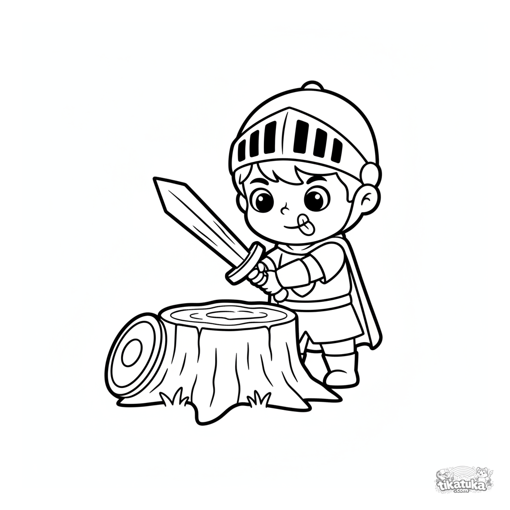 Ausmalbild eines jungen Ritters, der mit einem Holzschwert an einem Baumstumpf übt. Für Kleinkinder von 3 bis 5 Jahren.