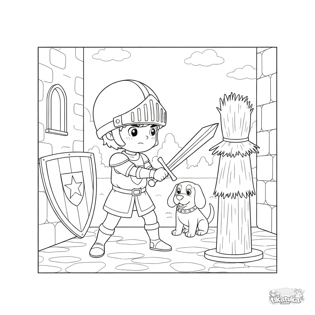 Ausmalbild eines jungen Ritters, der mit einem Holzschwert im Burghof übt. Für Kinder von 5-8 Jahren. Enthält einen Schild, eine Strohpuppe und einen treuen Hund.
