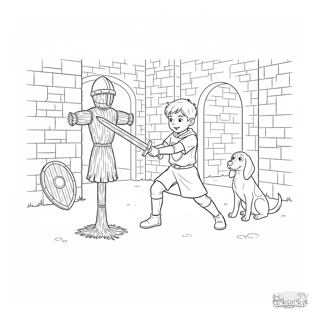 Ausmalbild für Kinder 5-8: Ein junger Ritter in einer Wappen-Tunika übt mit einem Holzschwert an einer Strohpuppe auf einem Burghof, beobachtet von einem treuen Hund.