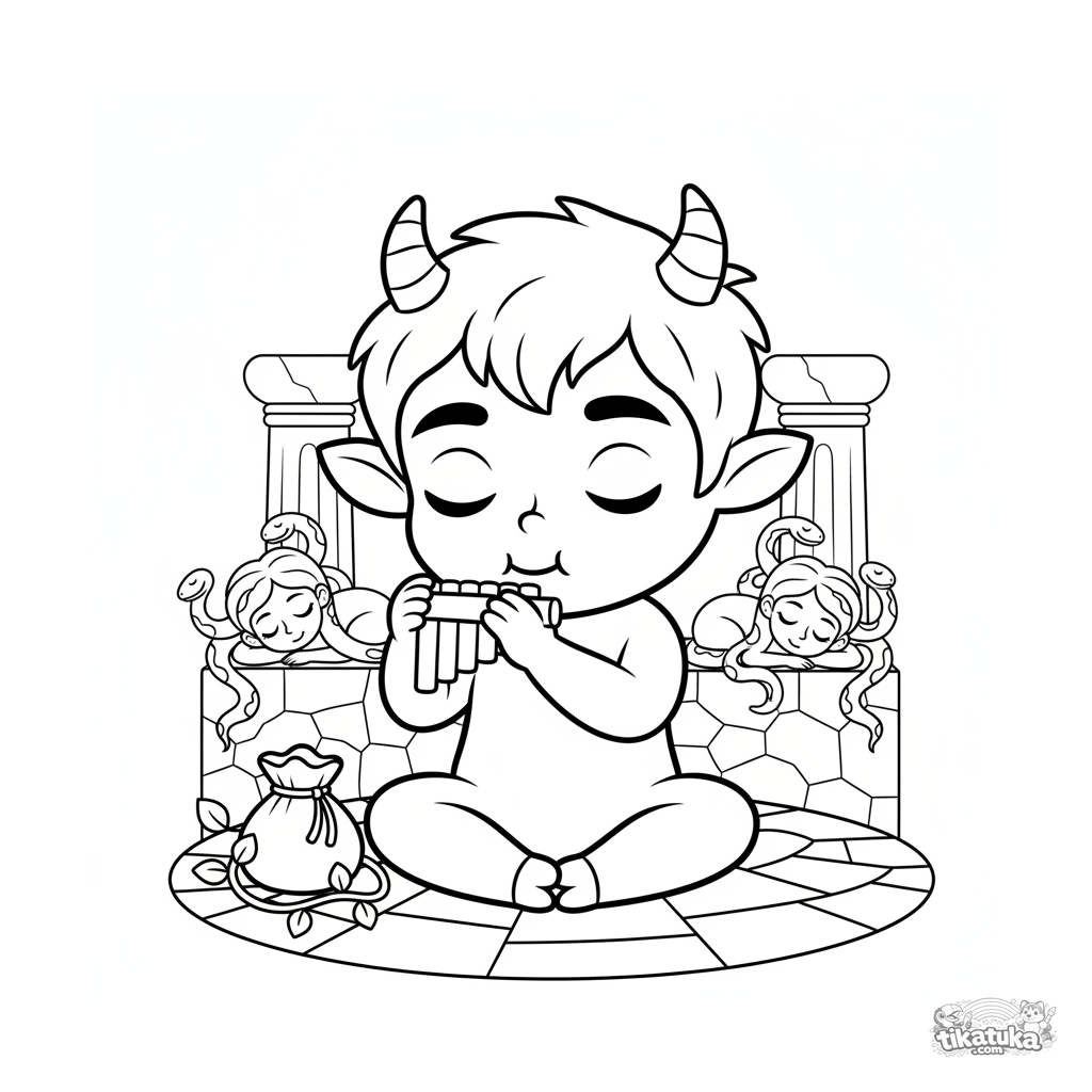 Ausmalbild für Kinder 7-9: Ein fröhlicher junger Satyr spielt eine Panflöte in der steinernen Gorgonenhöhle. Eine dynamische und ausdrucksstarke Szene zum Ausmalen.