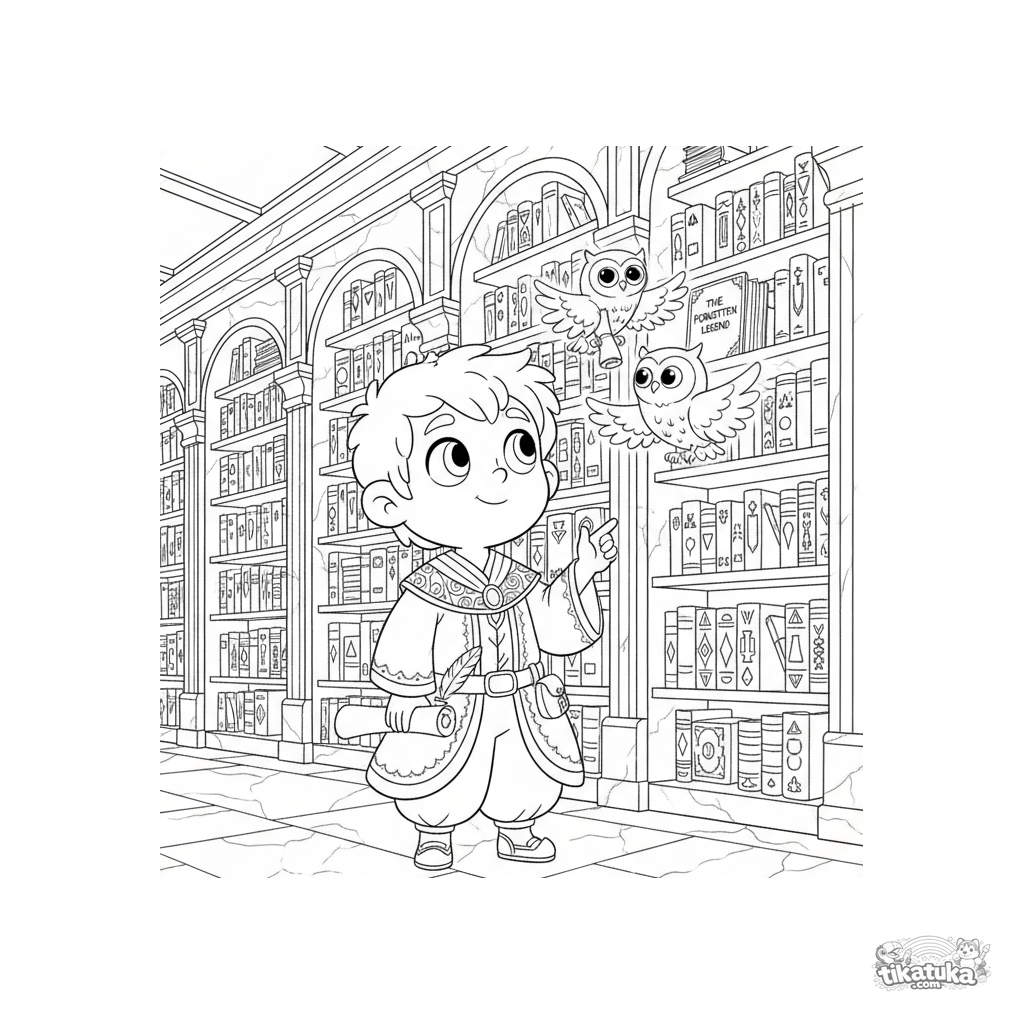 Ausmalbild für ältere Kinder: Ein junger Schreiber trifft Eulengötter in einer Marmorbibliothek. Eine detaillierte Szene für die Fantasie, geeignet für Kinder von 7-11 Jahren.
