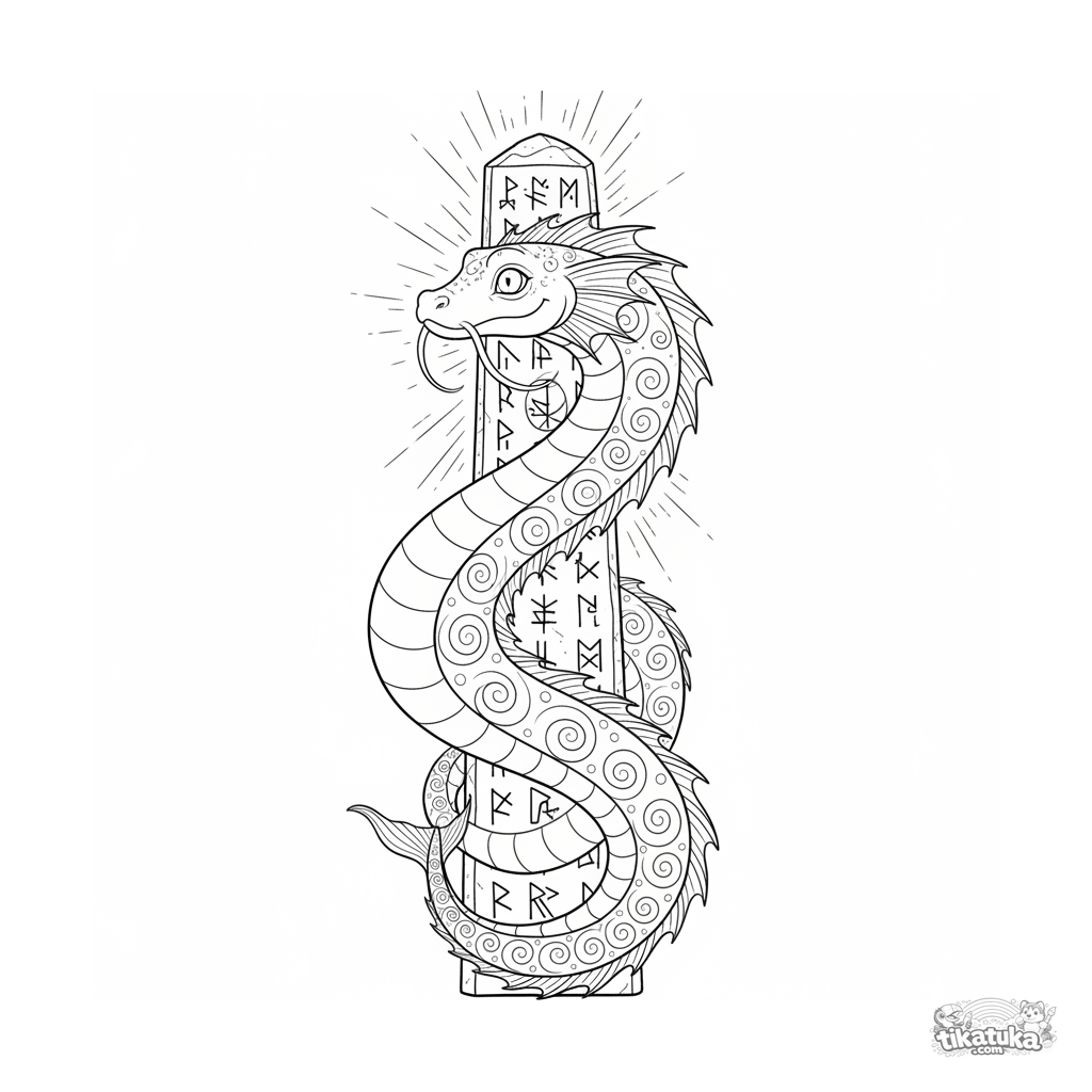 Ausmalbild einer jungen Seeschlange, die einen alten Runenstein erkundet. Für ältere Kinder von 10-12 Jahren. Detaillierte Illustration eines mythischen Wesens.
