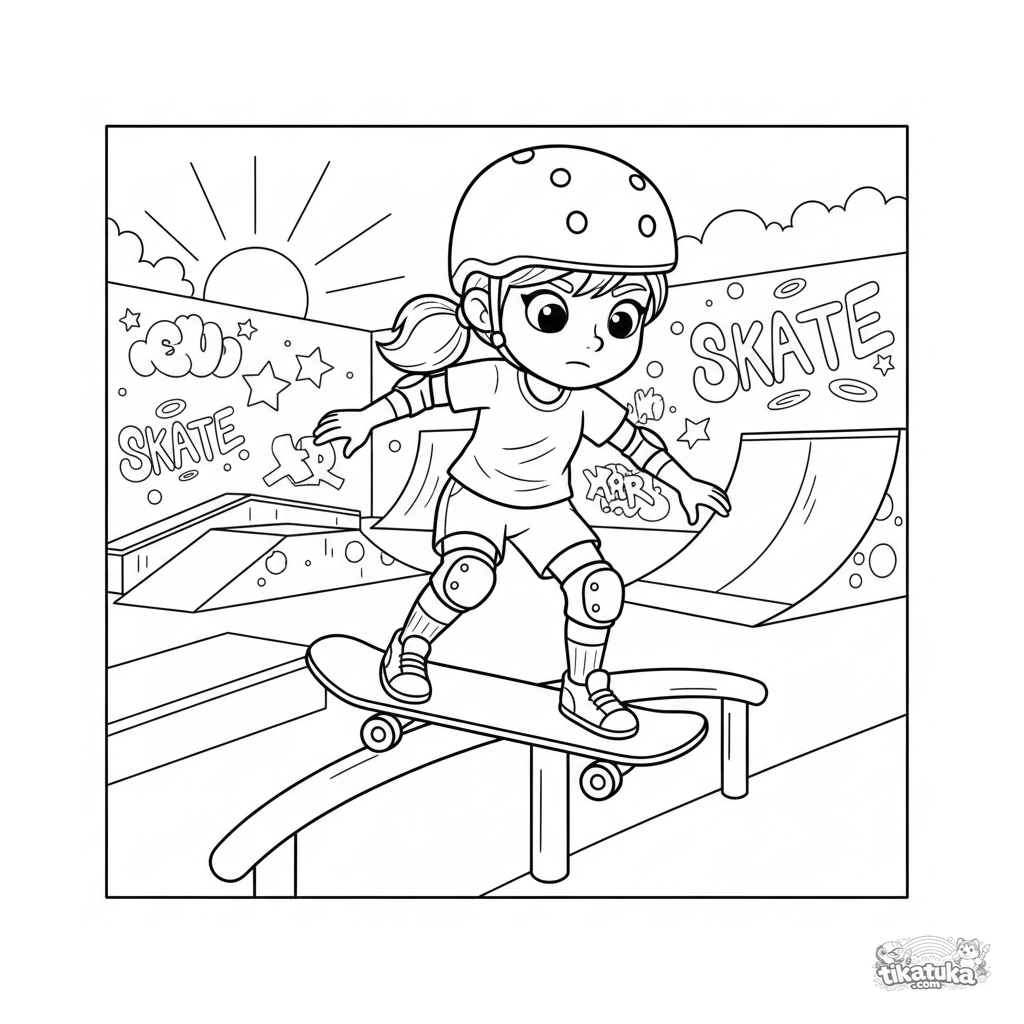 Ausmalbild für Kinder 4-6: Ein Mädchen auf einem Skateboard balanciert auf einem Geländer im Skatepark. Eine lustige Sportszene mit Schutzausrüstung.