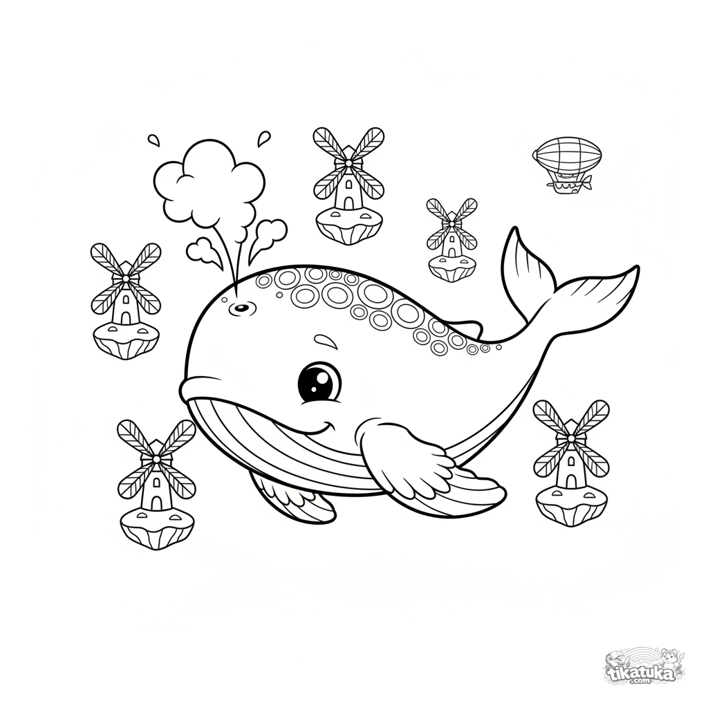 Ausmalbild eines Himmelswal-Kalbes, das zwischen schwebenden Inseln mit Kristallsegeln schwimmt. Für Kinder von 7-9 Jahren.