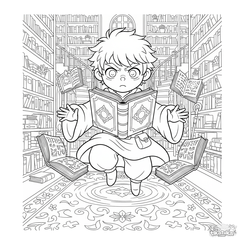 Ausmalbild für 10-12 Jahre: ein junger Zauberlehrling übt Levitation zwischen schwebenden Folianten in einer alten Bibliothek. Detaillierte Fantasieszene.