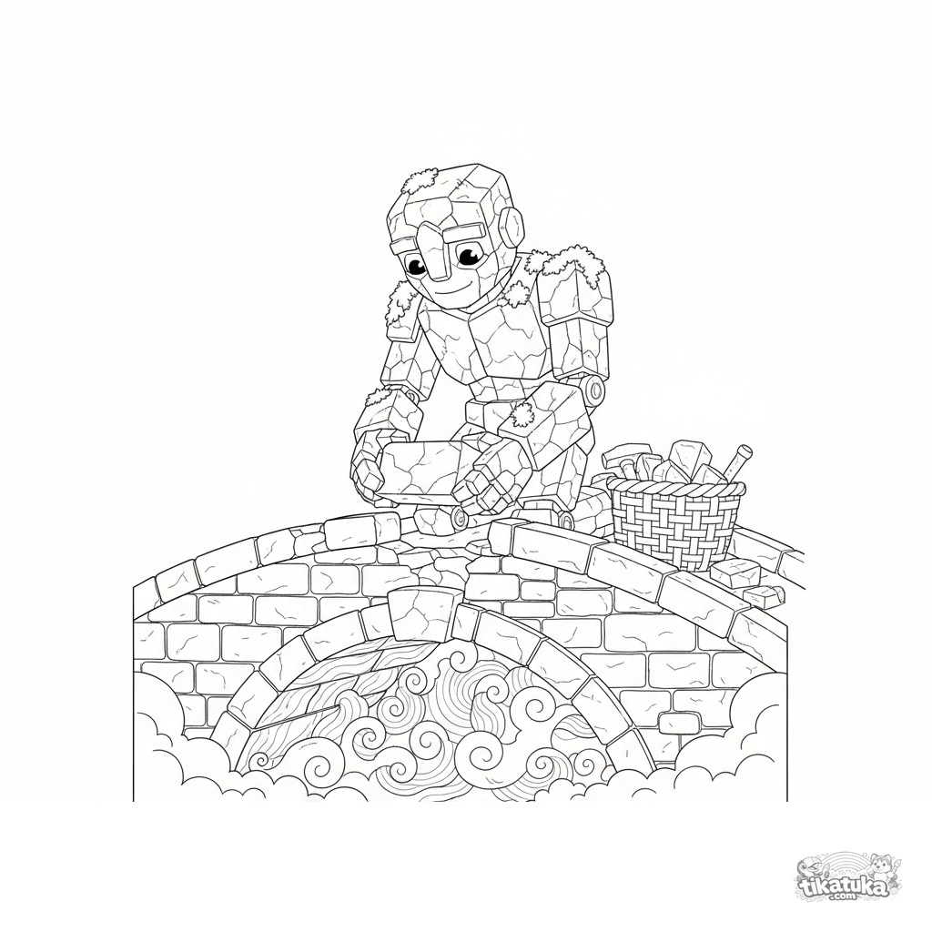 Ausmalbild für ältere Kinder 10-12: Ein junger Stein-Golem repariert sorgfältig eine alte Brücke in einer nebligen Schlucht. Detaillierte Fantasieszene.