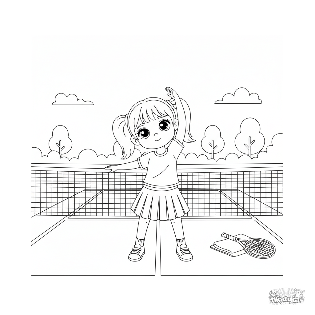 Ausmalbild für Kinder 4-6 Jahre: junge Tennisspielerin dehnt sich am Netz. Mäßiges Detail, klare Formen.