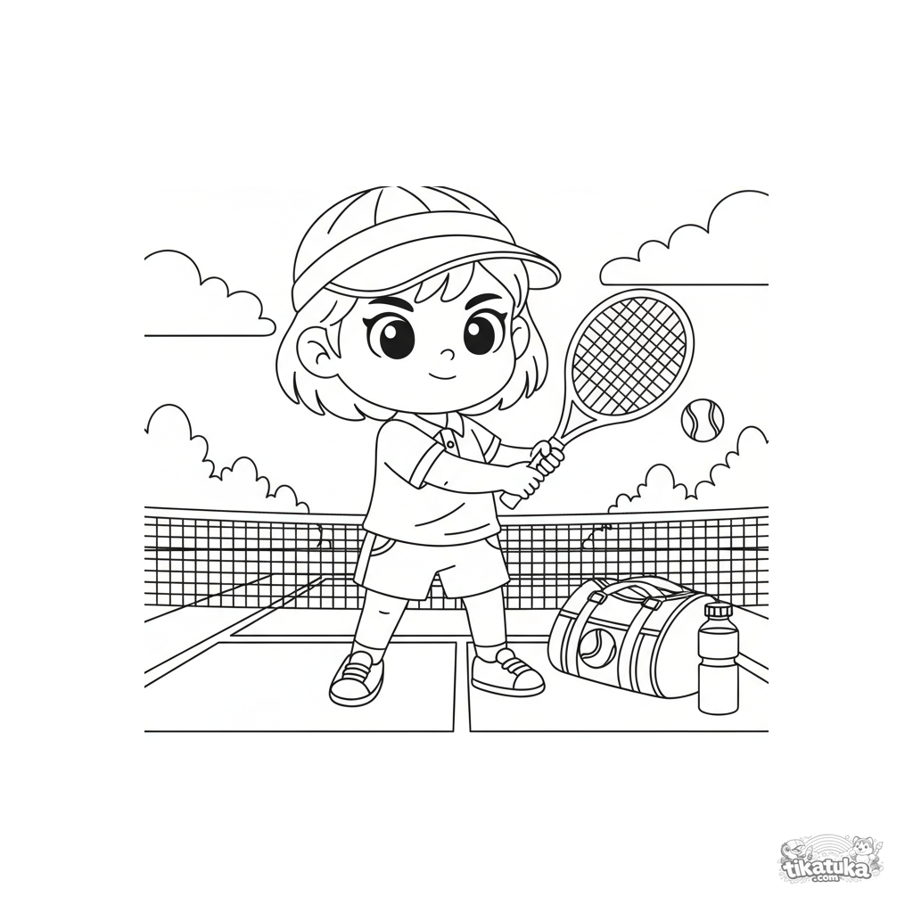 Ausmalbild für Kinder 4-6: Ein junger Tennisspieler trainiert auf einem Platz mit Netz. Ganzkörperansicht des Kindes mit Schläger, Tasche und Wasserflasche.