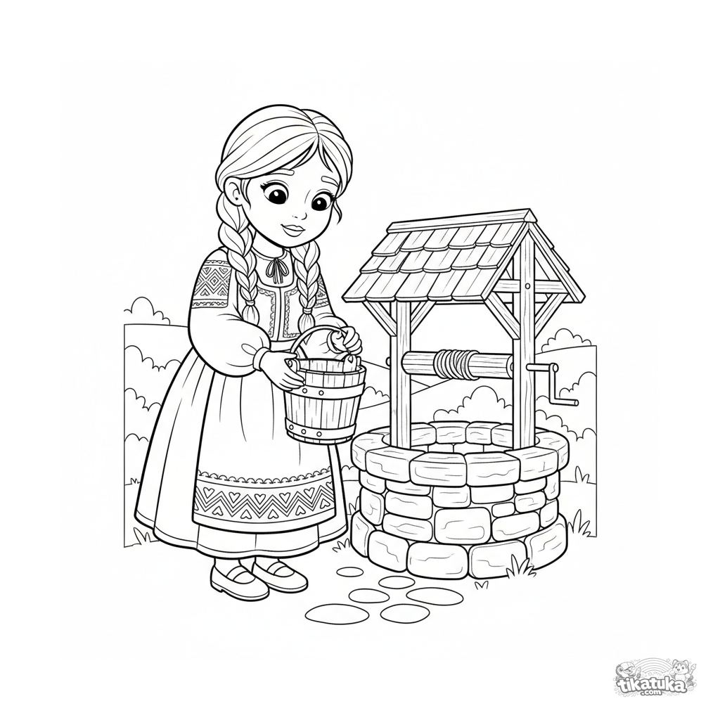 Ausmalbild für Kinder 4-6: Ein Mädchen in Tracht schöpft Wasser aus einem magischen Brunnen. Einfache Formen und eine süße Dorfszene.