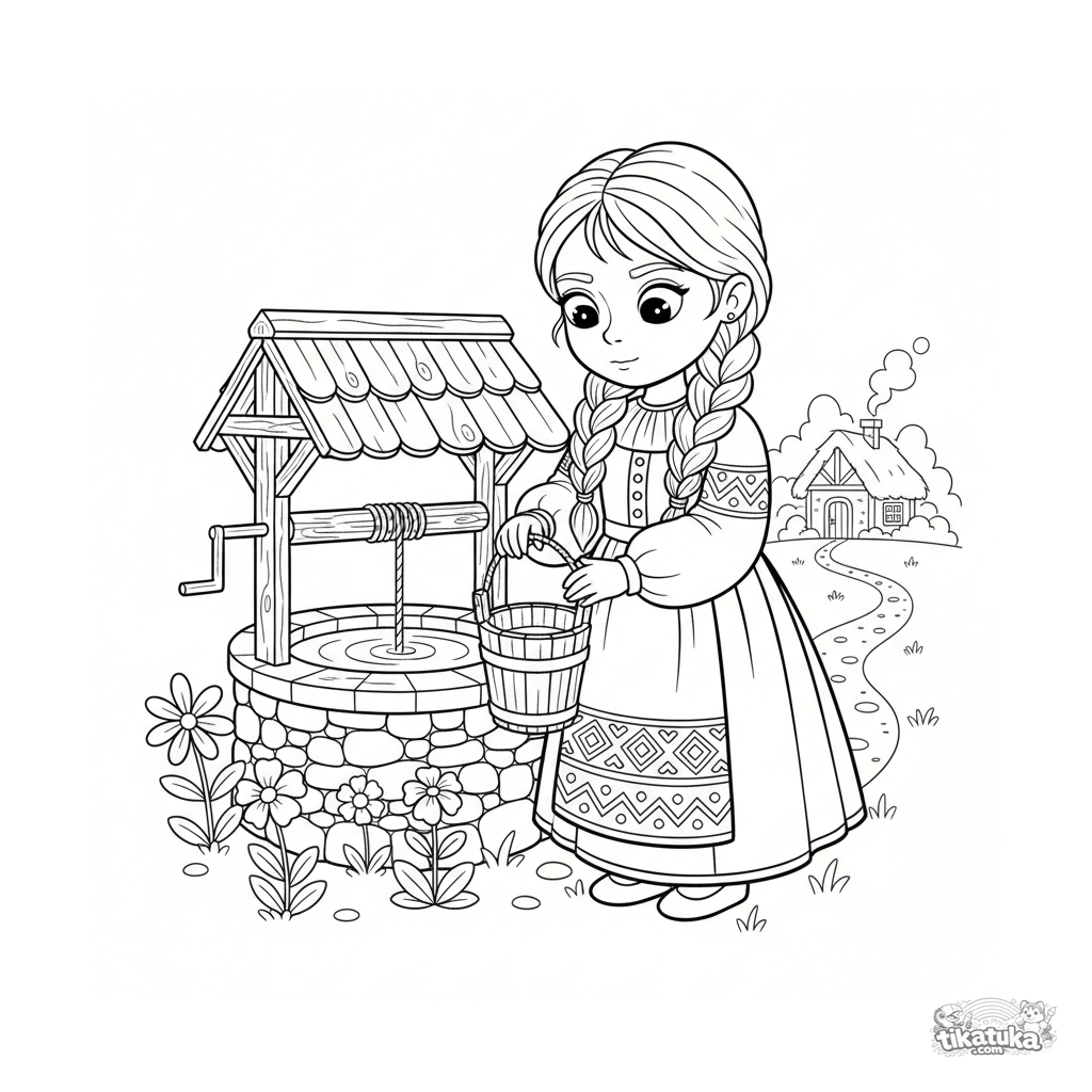 Ausmalbild für Kinder 4-6: Ein Mädchen in Volkstracht schöpft Wasser aus einem Dorfbrunnen. Einfache Formen, klare Geschichte.
