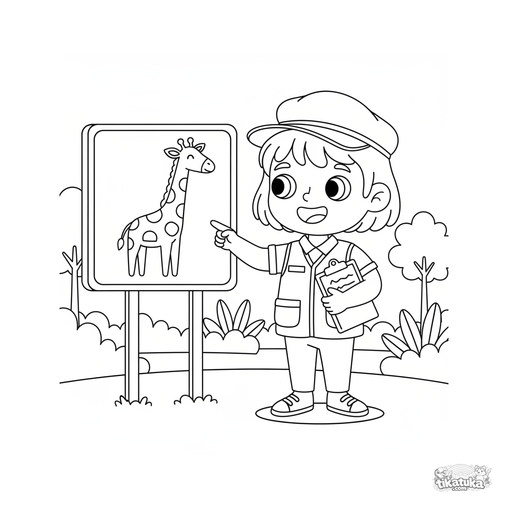 Ausmalbild für Kinder 4-6: Ein junger Tierpfleger erklärt Giraffen-Fakten neben einem großen Infoschild. Lehrreiche Szene über Berufe und Tiere.