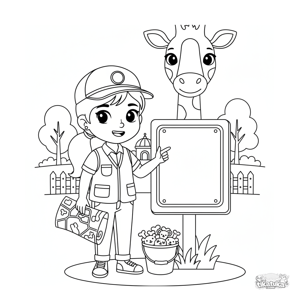 Ausmalbild für Kinder 4-6: ein junger Tierpfleger am giraffenförmigen Informationsschild im Zoo. Lehrreiche Szene über Berufe.