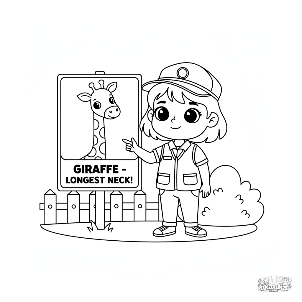 Ausmalbild für Kinder 4-6: Ein junger Tierpfleger erklärt Giraffen-Fakten an einem großen Informationsschild. Einfache Lernszene zum Kreativsein.