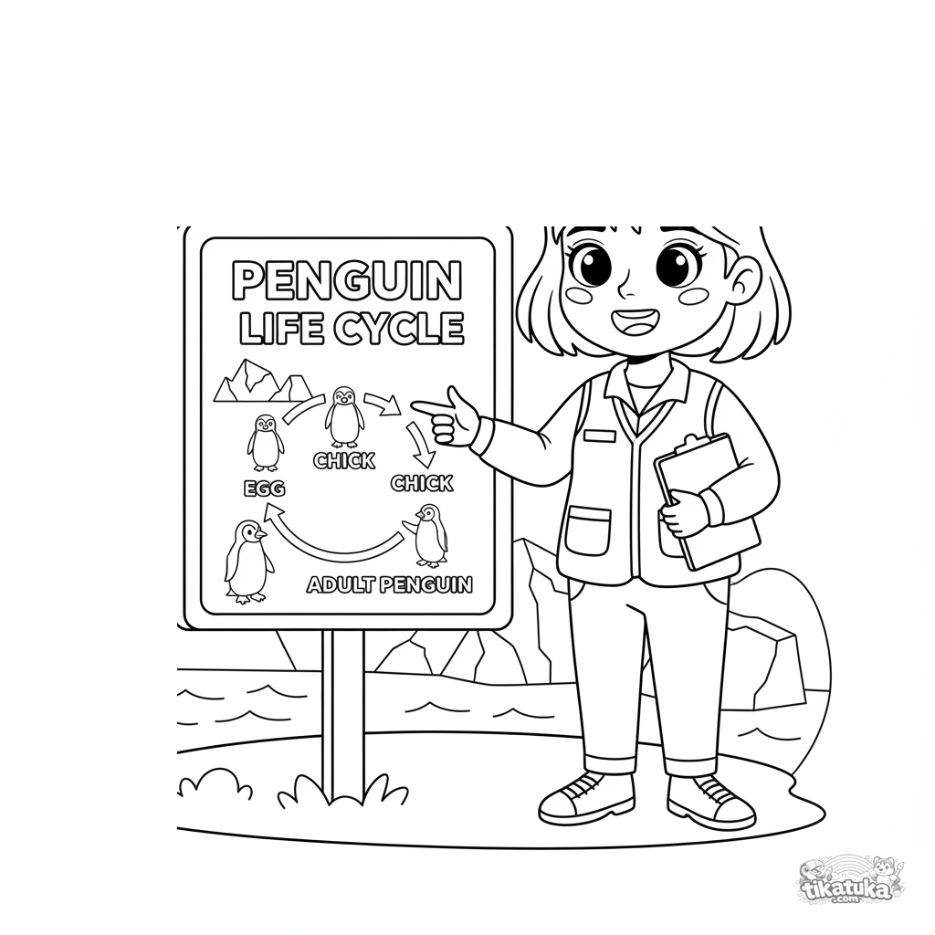 Ausmalbild für Kinder 4-6: Ein junger Tierpfleger erklärt die Informationen zum Pinguin-Lebensraum. Lerne über Berufe und Tiere.