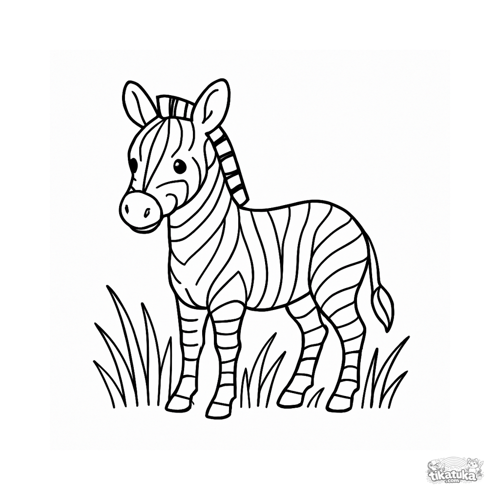 Ausmalbild für Kinder. Ein niedliches Zebrafohlen mit schwarz-weißen Streifen steht im hohen Savannengras mit aufmerksamen Ohren. Kostenlos herunterladen.