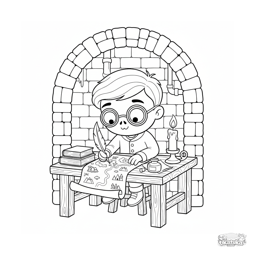 Ausmalbild für Kinder 4-6: Ein gelehrter Zombie-Kartograf zeichnet eine Karte in einer Backsteinnische im Abwasserkanal.