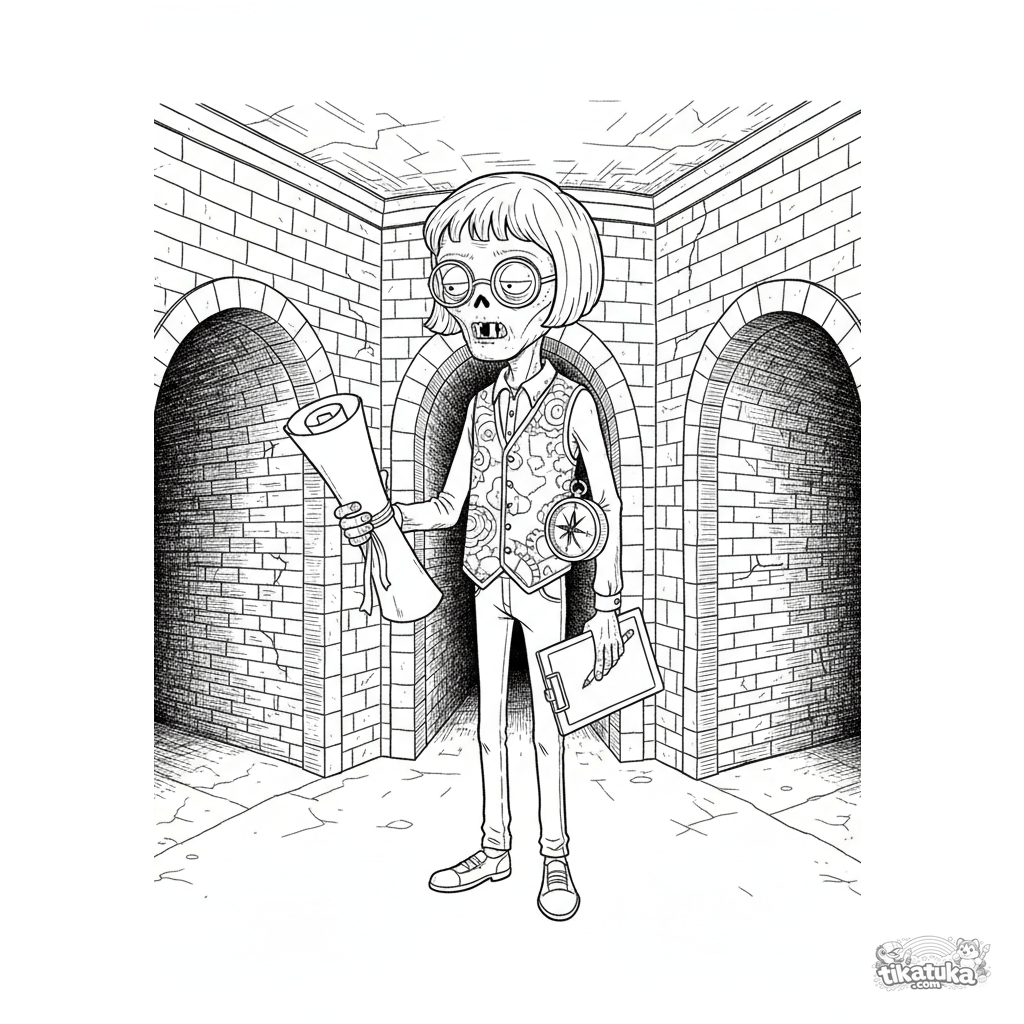 Detailliertes Ausmalbild für Kinder 10-12: Ein Zombie-Kartograf mit Karte und Kompass studiert eine Tunnelkreuzung im Sammelkanal. Vintage-Gravurstil.