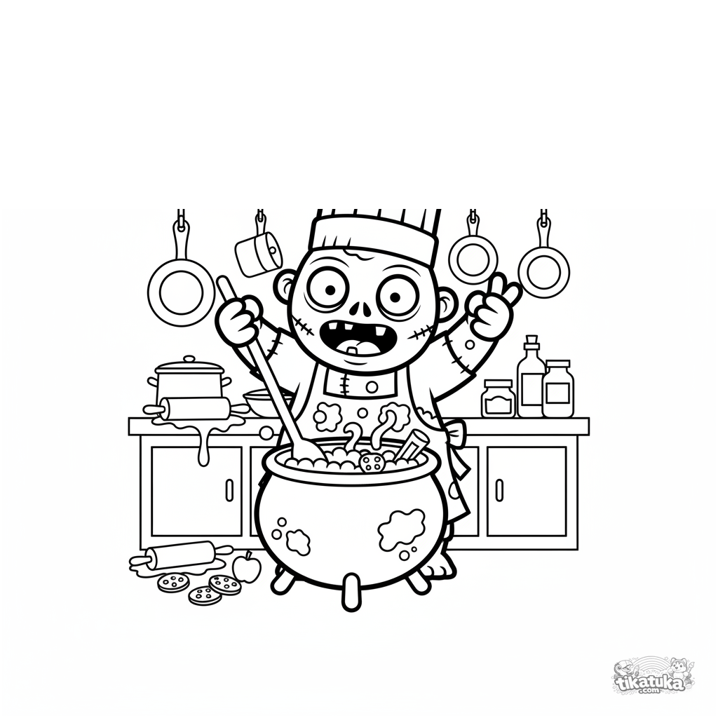 Ausmalbild für Kinder 4-6: ein freundlicher Zombie mit Kochmütze rührt einen Kessel in der Küche um. Lustige Szene, mittlerer Detaillierungsgrad.