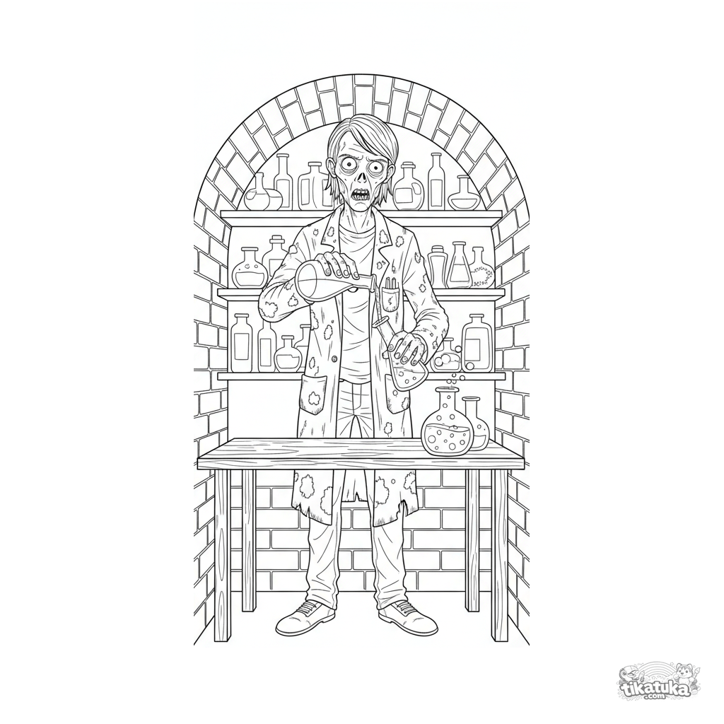 Detailliertes Ausmalbild für Kinder von 10-12 Jahren: ein Zombie-Chemiker experimentiert in einem unterirdischen Kanalisationslabor.