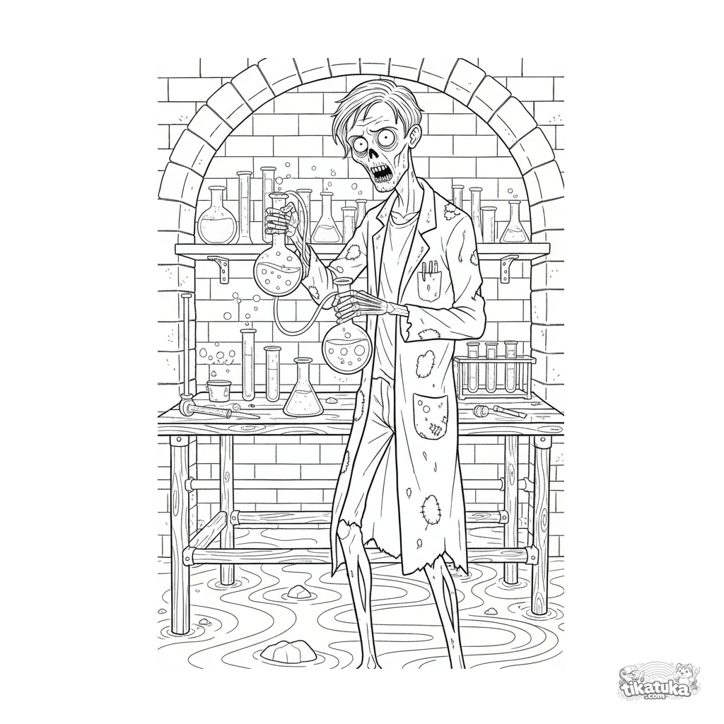 Detailliertes Ausmalbild für Kinder 10-12 Jahre: ein Zombie-Chemiker experimentiert in einem improvisierten Labor im Sammelkanal. Viele Details und Laborgeräte.