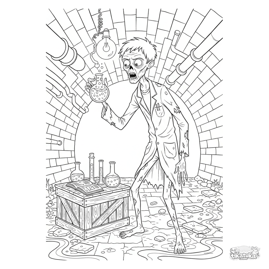 Detailliertes Ausmalbild für Kinder 10-12: ein Zombie-Chemiker in einem zerrissenen Laborkittel experimentiert mit Wasser in einem unterirdischen Abwasserkanal-Labor. Viele Elemente.