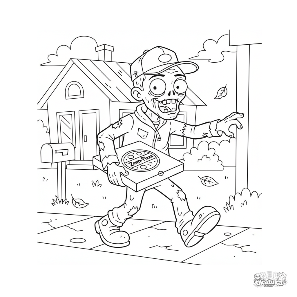 Lustiges Ausmalbild für Jungen von 4-6 Jahren: ein freundlicher Zombie-Lieferant mit einer Pizza. Eine fröhliche, unerschreckende Szene.