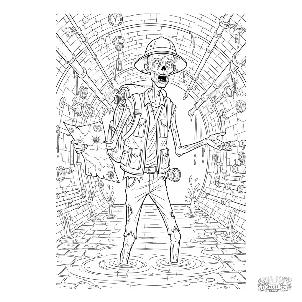 Detailliertes Ausmalbild für Kinder 10-12: ein Zombie-Entdecker mit einer Karte in einer überfluteten Abwasserkammer. Viele Elemente zum kreativen Ausmalen.