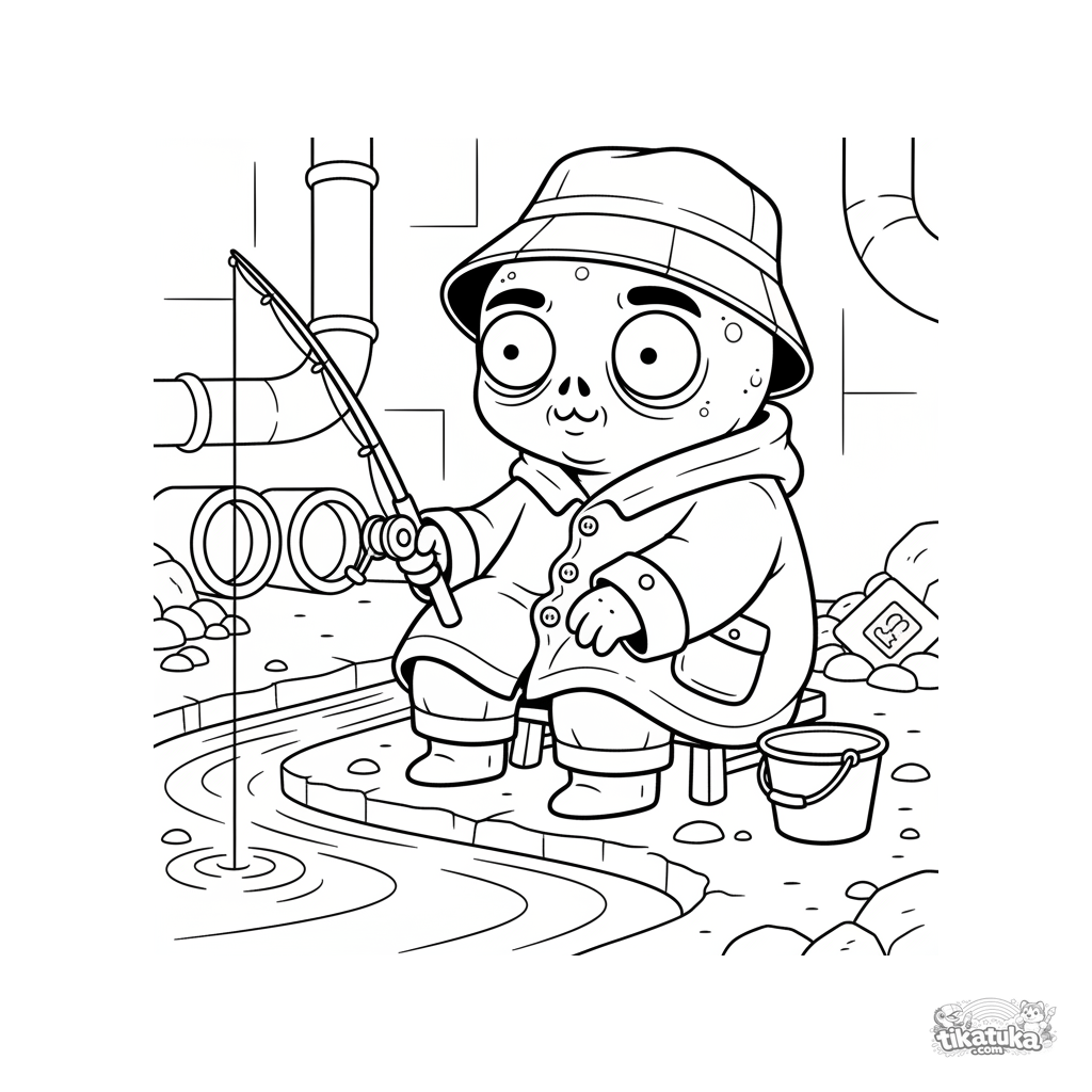 Ausmalbild für Kinder von 7-9 Jahren: ein Zombie-Angler sitzt geduldig mit einer Angel an einem Bach in einem Kanalsammler.