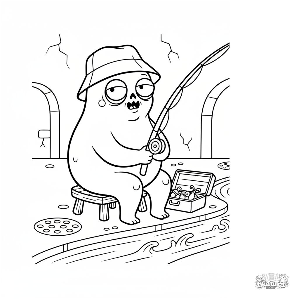 Ausmalbild für Kinder 4-6: ein ruhiger Zombie mit Hut angelt mit einer Rute an einem langsamen Bach im Abwasserkanal. Eine friedliche und lustige Szene.