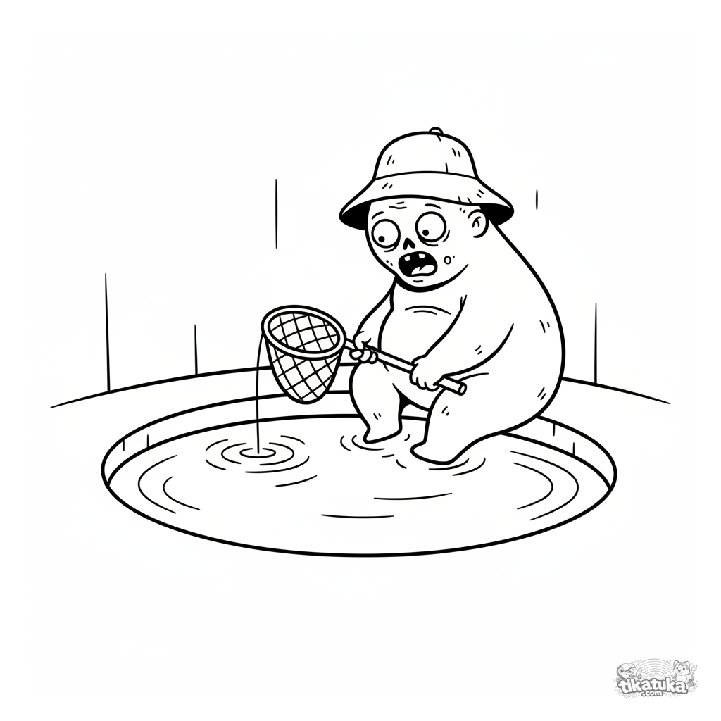 Einfaches Ausmalbild für Kleinkinder 2-3 Jahre: ein freundlicher Zombie-Angler sitzt am Wasser im Sammelkanal. Große Formen, wenige Details, breite Ränder.