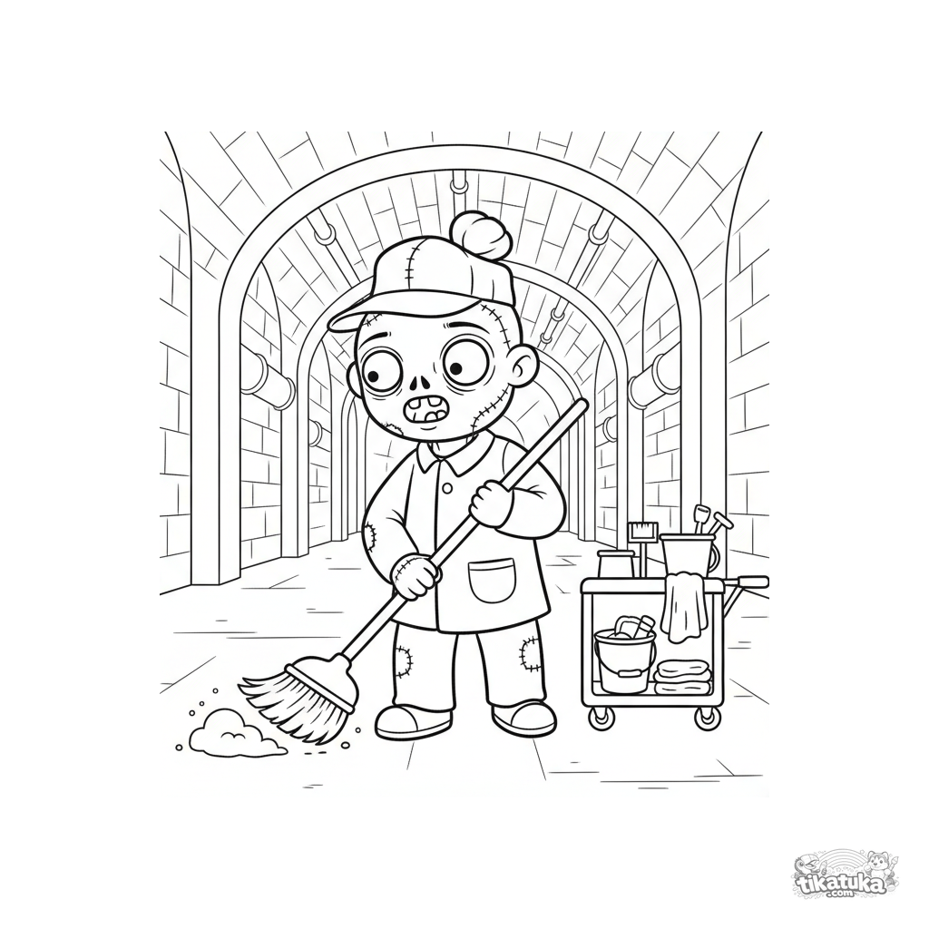 Ausmalbild für Kinder von 4-6 Jahren: ein gutmütiger Zombie-Hausmeister fegt den Boden in einer riesigen Abwasserkanalhalle. Eine einfache, klare Szene mit weichen Formen.