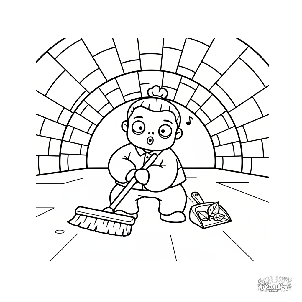 Sehr einfaches Ausmalbild für Kleinkinder von 2-3 Jahren: ein Zombie-Hausmeister fegt den Boden in einer großen Kanalisationshalle.