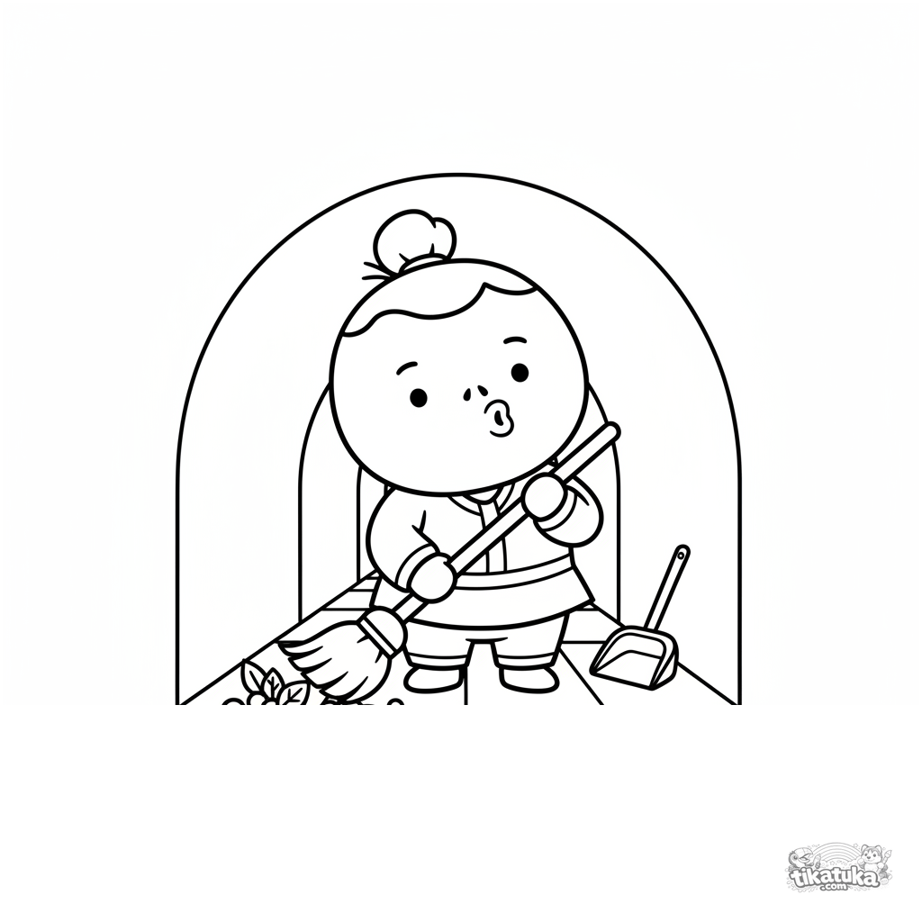Sehr einfaches Ausmalbild für Kleinkinder 2-3 Jahre: ein freundlicher Zombie-Hausmeister fegt einen Korridor in einem Abwasserkanal.
