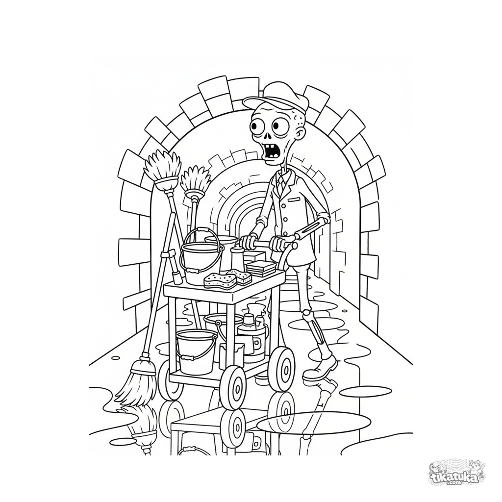 Ausmalbild für Kinder 7-9: ein Retro-Zombie-Hausmeister schiebt einen Reinigungswagen einen langen Abwasserkanal-Korridor entlang. Perspektive und sich wiederholende Bögen.