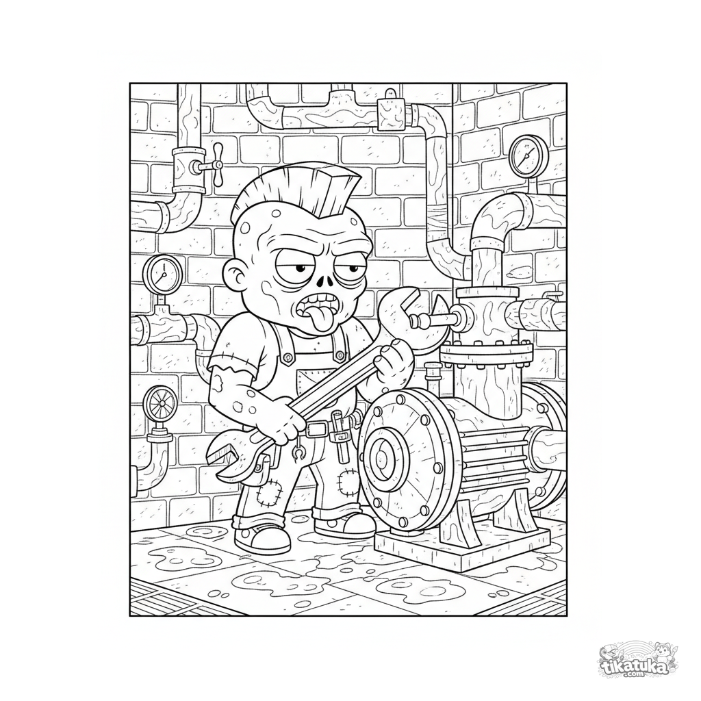 Detailliertes Ausmalbild für Kinder von 10-12 Jahren: ein Zombie-Mechaniker repariert eine Pumpe im Maschinenraum der Kanalisation.