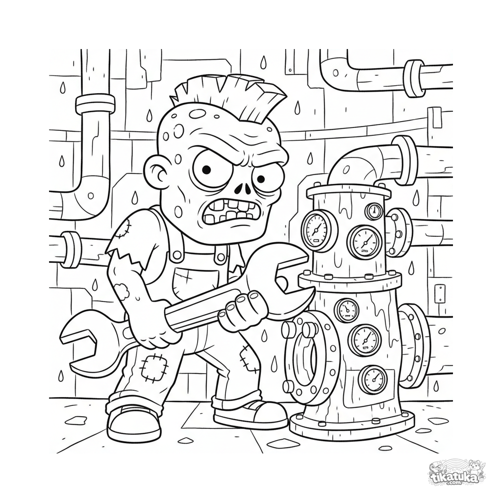 Ausmalbild für Kinder 7-9: ein Zombie-Mechaniker mit einem Schraubenschlüssel versucht, eine riesige Pumpe in einem Technikraum der Kanalisation zu reparieren.