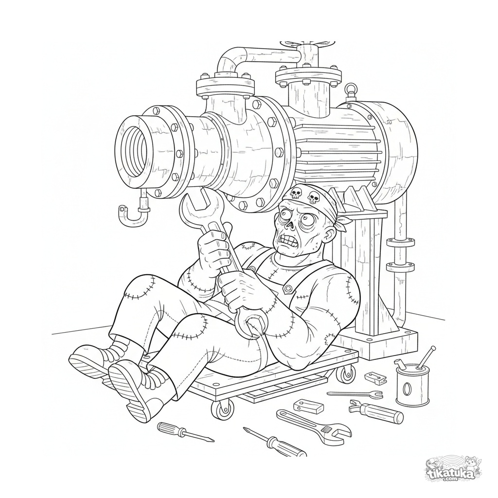 Komplexes Ausmalbild für Kinder 10-12 im technischen Stil: ein Zombie-Mechaniker mit einem Schraubenschlüssel repariert eine große rostige Pumpe in einem Abwasserkanal-Maschinenraum.