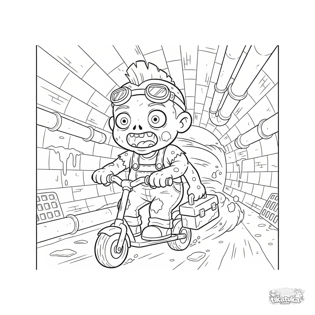 Ausmalbild für Kinder 4-6 Jahre: ein Zombie-Mechaniker saust fröhlich auf einem selbstgebauten Roller durch einen Abwassertunnel mit Werkzeugen. Dynamische Szene, Comic-Stil.