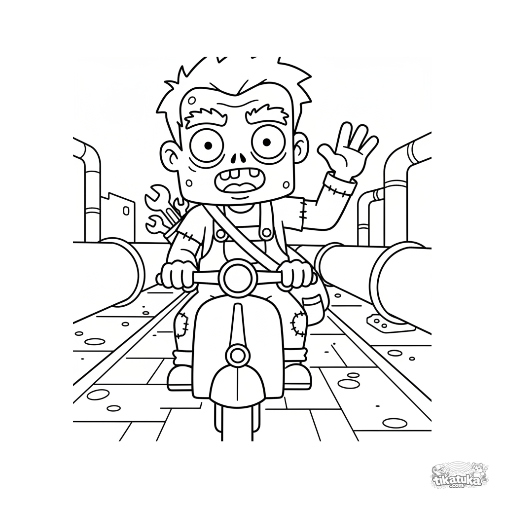 Ausmalbild für Kinder 7-9: Ein fröhlicher Zombie-Mechaniker fährt auf einem Roller durch einen geräumigen Sammelkanal. Dynamische Szene im 90er-Stil.