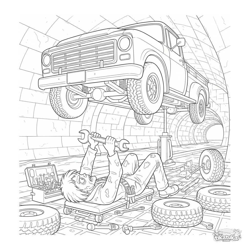 Technisches Ausmalbild für Kinder 10-12 Jahre: ein Zombie-Mechaniker repariert einen LKW in einer improvisierten Werkstatt im Sammelkanal. Viele Details und Werkzeuge.
